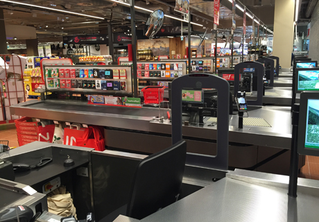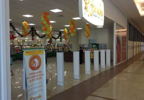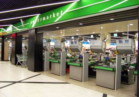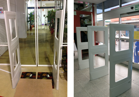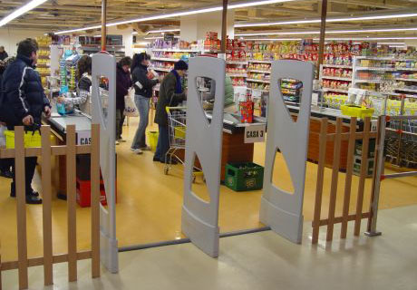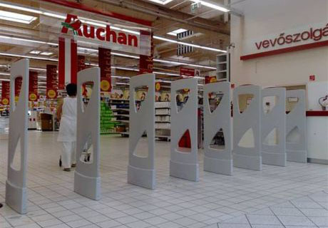 Szuper és hipermarketek áruvédelmét lehet pénztári vagy kijárati védelemmel segíteni. Egyedi szempontok döntik el, hogy melyik lopásgátló technológia (EM, AM, RF) kerüljön felhasználásra az adott helyen. Az áruféleségek sokasága miatt célszerű más, kiegészítő védelmet is használni.